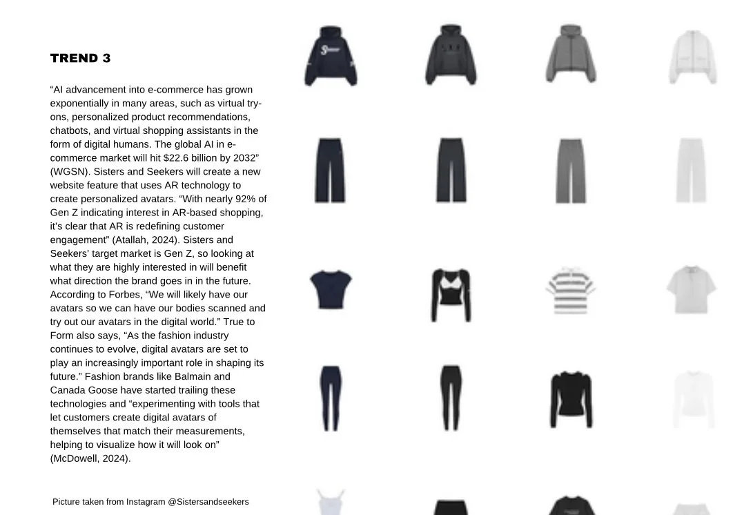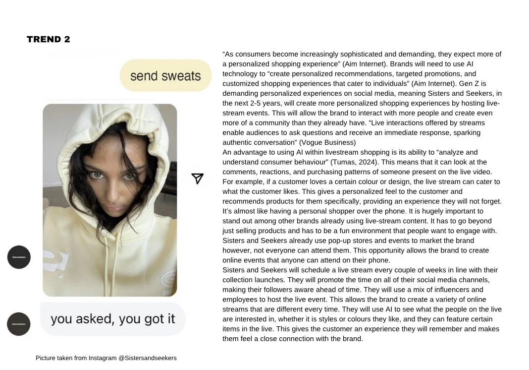 My Trend report explores how emerging technologies, in particular AI, will shape the future of fashion. For Sisters and Seekers, I predicted that they will use AI to create personalised shopping experiences that ensure consumer loyalty.