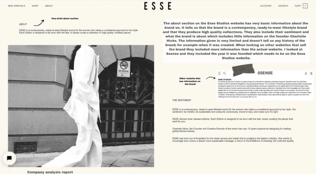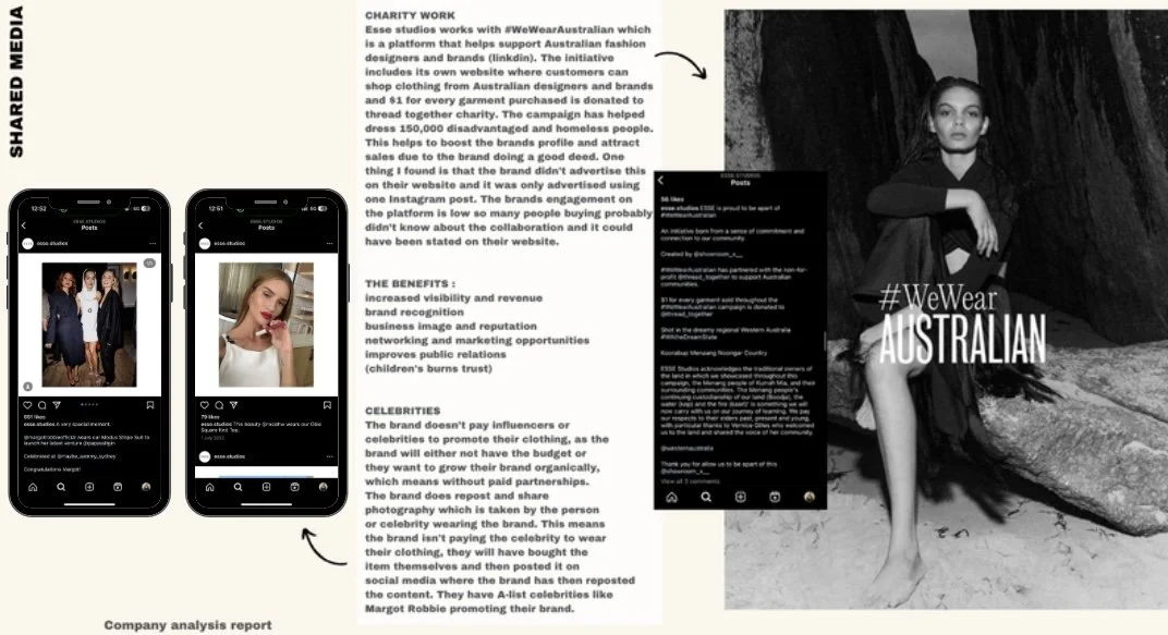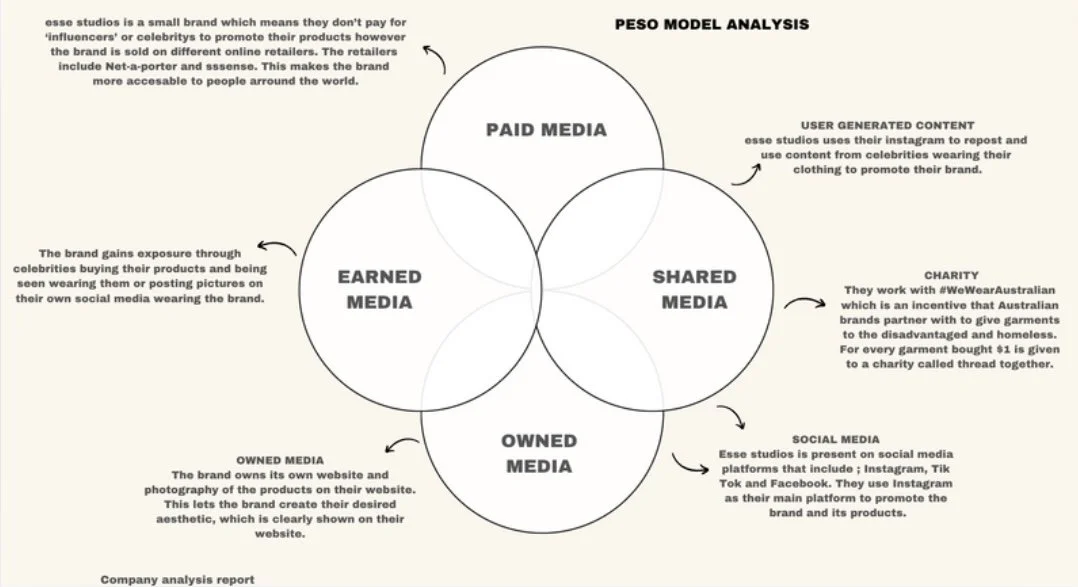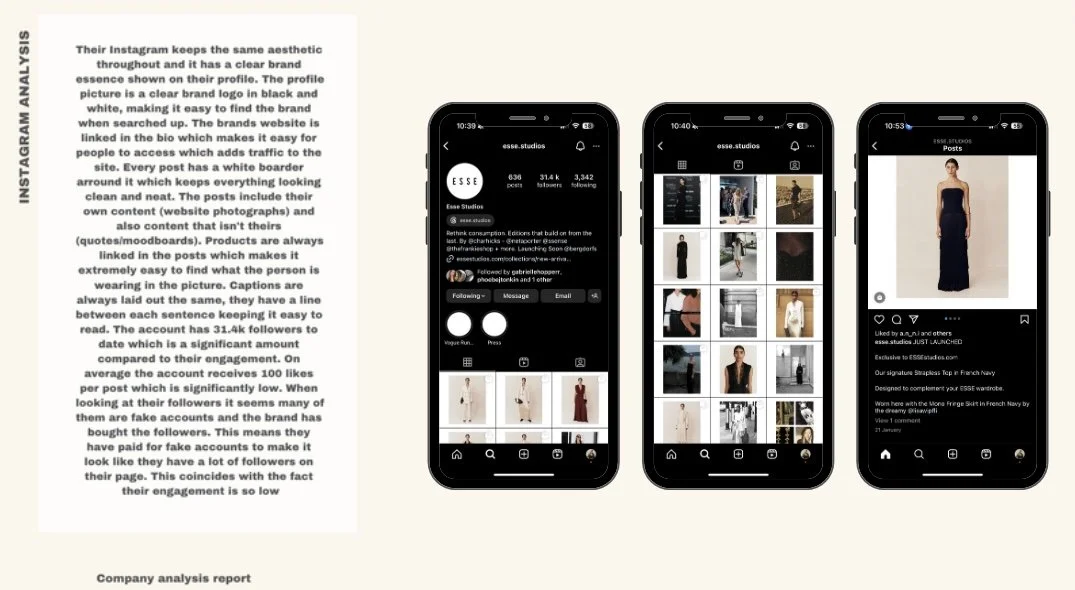 Company analysis report looking in-depth and Esse Studios’ social media strategy. Including research into their brand, social media engagement, and the different types of media. Research shows the platforms the brand is active on, who they collaborate with, and what charities they work with.